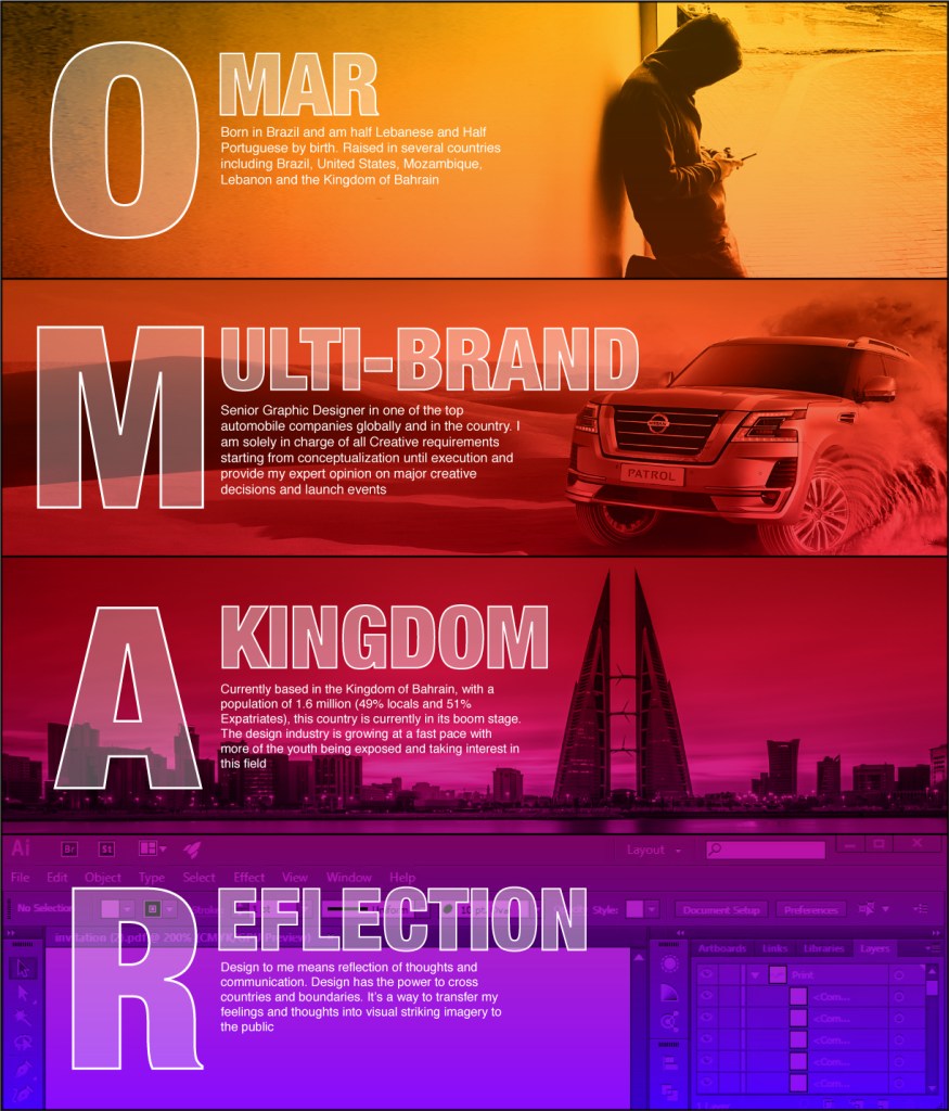 I am currently based in the Kingdom of Bahrain, which is a tiny island at the heart of the Middle East region. With a population of 1.6 million (49% locals and 51% Expatriates), this country is currently in its boom stage. The design industry is growing at a fast pace with more of the youth being exposed and taking interest in this field. Many international advertising agencies have established their presence in the country. Currently, the expatriate community of Lebanese are leading this industry and have shaped it for a very long time. However, as per my experience in Bahrain, I find that there are several designers that are not working in the industry due to their talent. Many became designers as part of their own business, job, or mainly because they failed in everything else. Therefore, the quality of design ranges from extremely good to extremely bad. The competition in Bahrain is fierce. Hence, this has always challenged me to provide my best.