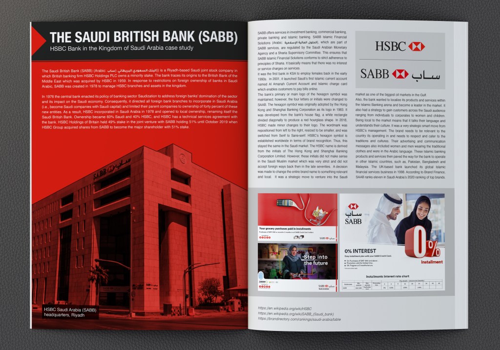 Also, the bank wanted to localize its products and services within the Islamic Banking arena and become a leader in the market. It also had a strategy to gain customers across the Saudi audience ranging from individuals to corporates to women and children. Being local to the market means that it talks their language and understands their culture. It was a very strategic smart move from HSBC’s management. The brand needs to be relevant to the country its operating in and needs to respect and cater to the traditions and cultures. Their advertising and communication messages also included women and men wearing the traditional clothes and were in the Arabic language. These Islamic banking products and services then paved the way for the bank to operate in other Islamic countries, such as, Pakistan, Bangladesh and Malaysia. The UK-based bank launched its global Islamic financial services business in 1998. According to Brand Finance, SAAB ranks eleven in Saudi Arabia’s 2020 ranking of top brands.