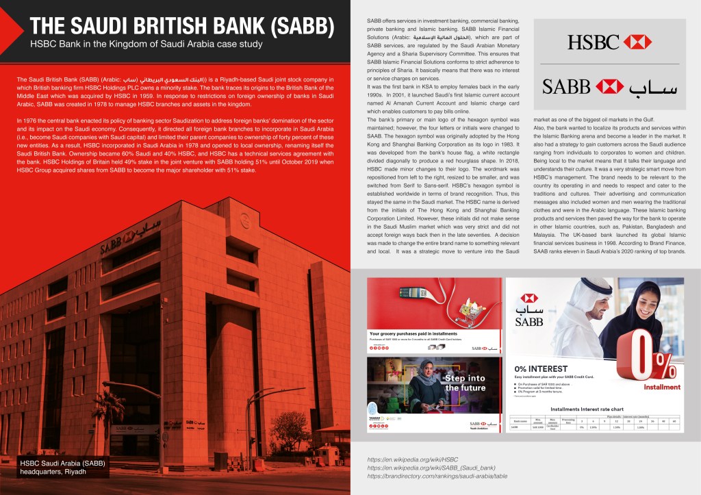 For this week’s workshop challenge, I decided to choose the case study option two about brands. As a graphic designer working in the advertising industry, I am amazed by brands and how they adapt to different markets and cultures to be relevant to their target audiences. After researching several food brands which are of interest, I decided to investigate the HSBC brand. A while back, I used to handle this brand as an account. It was very interesting to find that this brand adapts according to different markets. One market that stood out was the Saudi Arabian market, one of the biggest markets in the Middle East.