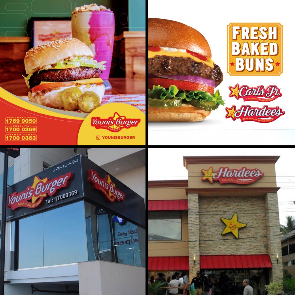 Younis Burger in the Kingdom of Bahrain is a local burger restaurant that did not spend much time creating a unique identity for itself. It basically copied the international brand of Carl’s Junior or Hardee’s. There’s no difference between Carl’s Junior and Hardee’s – Hardee’s is the East Coast equivalent of Carl’s Jr. … Hardee’s is a fixture in the South, Mid-Atlantic, and Midwest. Carl’s Jr. is big in the West. They use the same branding — the distinctive red-and-yellow color scheme and that zippy little star logo.