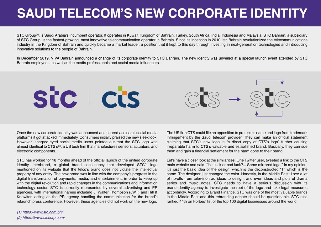 The US firm CTS could file an opposition to protect its name and logo from trademark infringement by the Saudi telecom provider. They can make an official statement claiming that STC’s new logo is “a direct copy of CTS’s logo” further causing irreparable harm to CTS’s valuable and established brand. Basically, they can sue them and gain a financial settlement for the harm done to their brand.