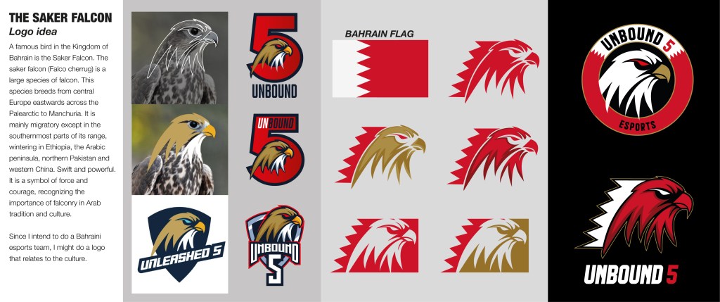 Initially before thinking of logos, I started thinking of different names for this elite team. I decided to go with “Unleash 5”. The eSports team usually consists of 5 members or players. As for the five ideas, I thought of having some concepts revolving around patriotism, flag colors or letters and digits.