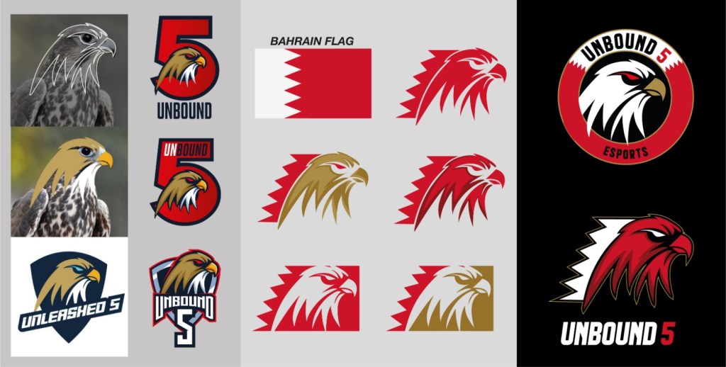 My next attempts went into incorporating the Saker Falcon as the hero, but this time incorporating the patriotic element which the flag and its colors of white and red. Also, I brought in the element of golden because Bahrain is well known for its gold. Then I attempted to play with several sketches and finally decided to incorporate the 5 zigzag designs of the flag at the back of the falcon’s head.