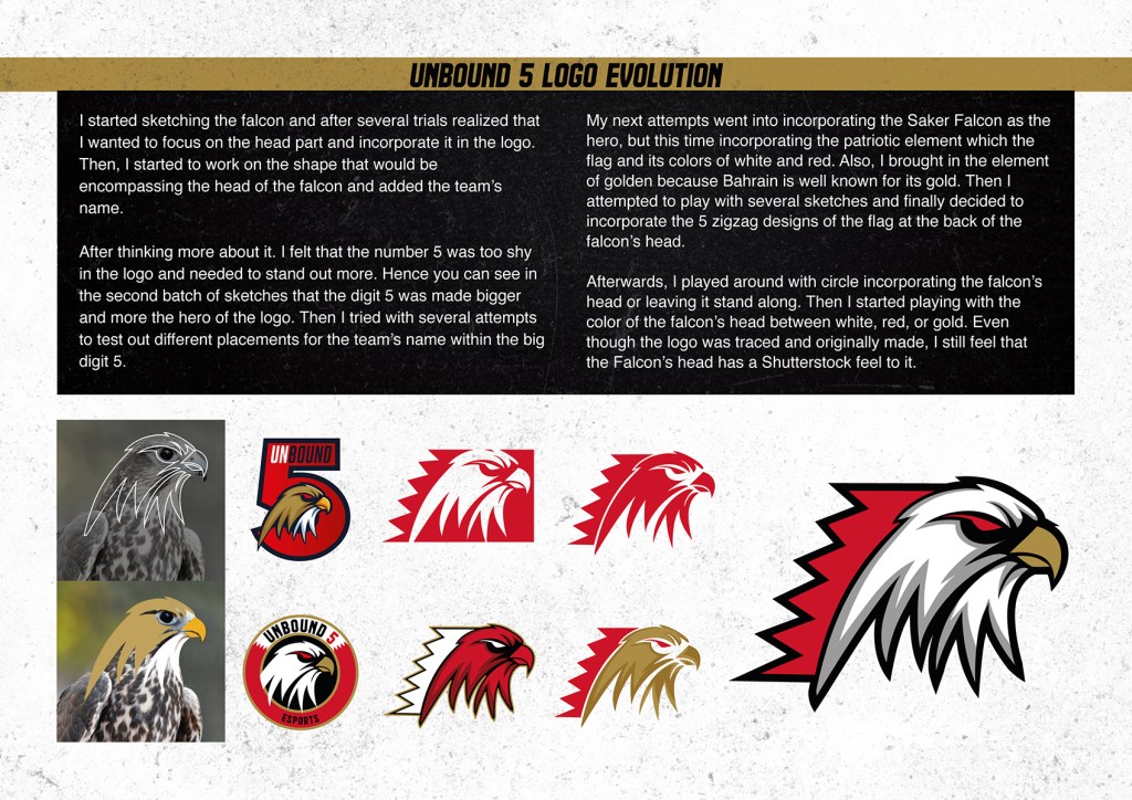 Usually these kinds of projects take many weeks to develop, however I tried to do the best I can within the deadline time span. After getting comments from my peers, I finally chose to go with the Saker Falcon option for the logo. I started sketching the falcon and after several trials realized that I wanted to focus on the head part and incorporate it in the logo. Then, I started to work on the shape that would be encompassing the head of the falcon and added the team’s name.