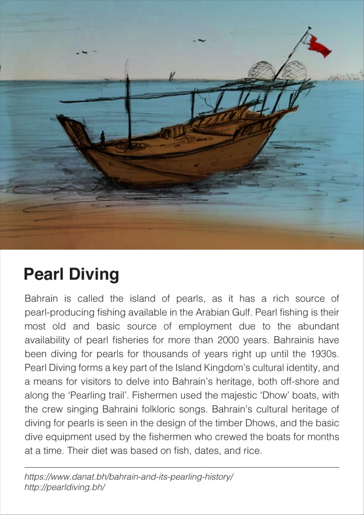 For this week’s workshop challenge, I have decided to delve into two very interesting topics about the city of Manama’s history – Pearl Diving & Bahrain Fort (the Portuguese Invasion).